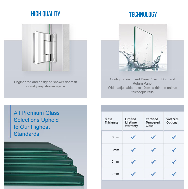 Mamparas de ducha con marco de acero inoxidable: fabricación experta de mamparas de ducha, material y color del marco personalizables, dimensiones de la mampara de ducha, color y grosor del vidrio. El marco está tratado con procesos impermeables y antioxidantes. El vidrio está hecho de vidrio templado apto para automóviles, que se somete a un proceso de templado calentado a 680-720 °C y luego enfriado cuidadosamente. El vidrio de la mampara de ducha cuenta con una alta resistencia al impacto y cualidades a prueba de explosiones: no menos de 40 partículas en 25 cm2.