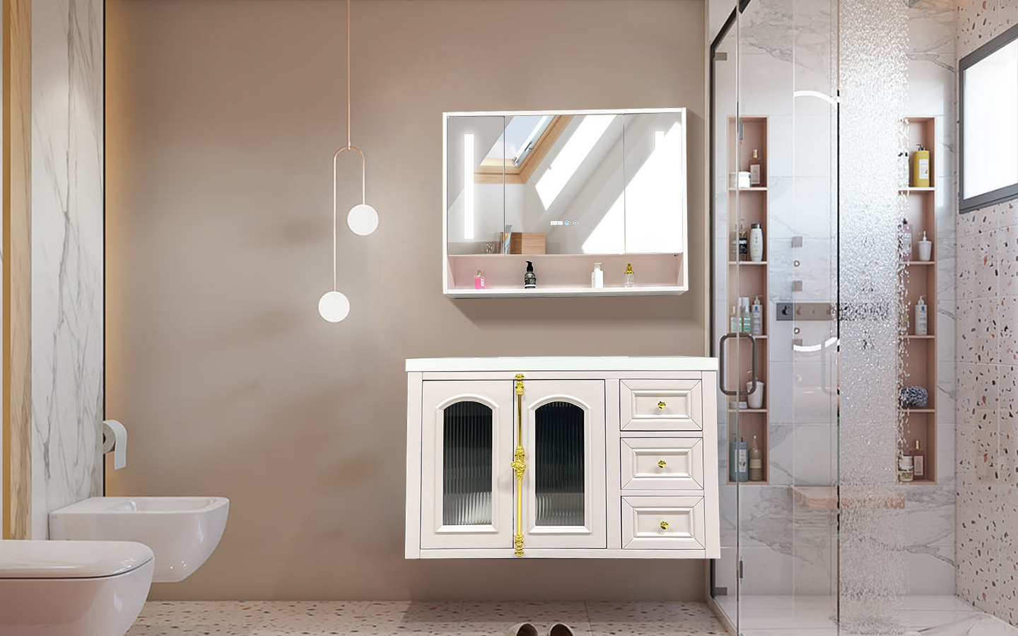Elevating the vanity’s functionality, the intelligent mirror cabinet is equipped with three key features. LED lights illuminate the space, the defogging function ensures clarity, and the time display adds a modern touch to your grooming routine.