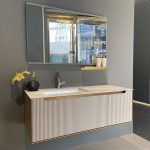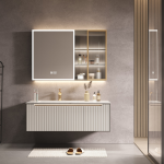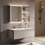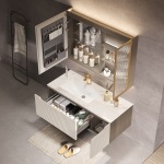 Unified Design with Ceramic Basin: The bathroom cabinet’s countertop is seamlessly integrated with a ceramic basin, creating a unified and contemporary look, meeting the aesthetic standards of 2024.