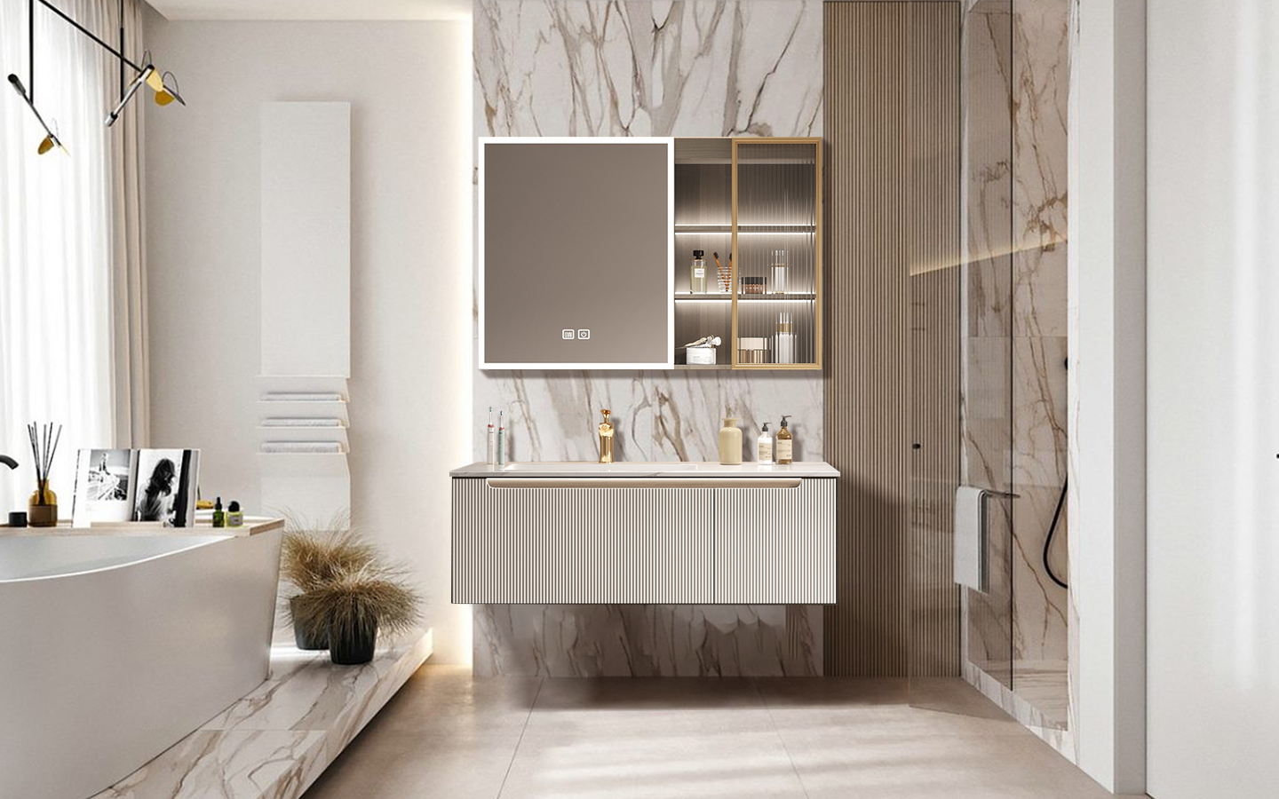 Smart Organization: The left side of the mirror cabinet features two tiers for efficient organization, while the right side offers a three-tier storage space with illuminated lights for a modern and organized bathroom experience.
