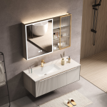Seamless Sintered Stone Countertop: Crafted with a Sintered Stone countertop, our bathroom cabinet achieves a seamless and modern aesthetic, complemented by a ceramic basin for a cohesive look.