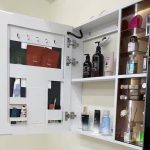 The middle section provides compartments for organized storage of cosmetics in various sizes, while the left side features a three-layer storage space with a glass door.