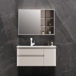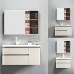 This bathroom vanity set comes with a mirror specifically designed for makeup enthusiasts. The mirror cabinet is divided into three areas, with the right-side mirror featuring hooks, a compartment for storing masks and makeup brushes, and a magnifying mirror. The left side contains double-layer storage space, while the right side features a three-layer storage space with LED lighting and a glass door. Customization options include LED lighting, gesture control, sensor activation, defogging, Bluetooth connectivity, and display of time and temperature.