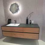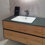 Customization options abound with the choice of solid wood or veneer finishes, paint colors, and wood grains for the vanity body. The countertop, crafted from sleek black Sintered stone, is paired with a white basin, offering further customization with options like marble or engineered stone and both under-mount and countertop basins.