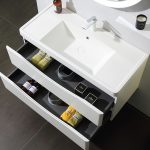 Elegant White Bathroom Vanity Set: This refined ensemble features a pristine white bathroom cabinet with a smooth and sleek surface, accentuated by minimalist drawer handles. With two spacious drawers equipped with smooth gliding rails, this vanity set ensures effortless storage. The cabinet’s construction materials can be customized, offering options such as solid wood or lacquer boards in various colors.