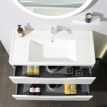 The elegant white bathroom vanity set combines style and functionality seamlessly.The countertop, made from durable engineered stone, ensures durability and easy maintenance. The mirror, featuring integrated lighting and defogging capabilities, adds a touch of sophistication.