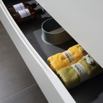 The countertop boasts a seamless engineered stone basin in a timeless white hue, crafted from durable engineered stone that resists stains and is easy to maintain. Additionally, the countertop features spill-proof edges for added convenience. Material customization options for the countertop include marble, Sintered stone, and variations suitable for both above-counter and under-counter installation.