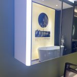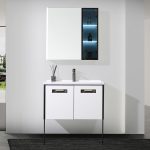 On the left side of the ensemble, the mirror cabinet features integrated LED light strips, illuminating your reflection with precision and clarity. On the right side, a side cabinet houses additional storage space while adding a touch of contemporary flair. Its glass door panel allows the embedded LED lights to emit a soft, ambient glow, enhancing the overall atmosphere of your bathroom.