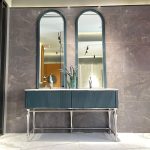 Reflecting timeless elegance, the vanity set features dual mirrors framed in the same alluring blue paint and solid wood frames as the main cabinet. To enhance its allure, the junction between the frame and the mirrors is embellished with discreet LED strips, casting a soft, ambient glow and adding a touch of sophistication to the ensemble.