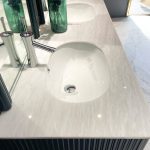 Adorned with a selection of unique veining patterns, the seamless marble countertop seamlessly integrates with a ceramic basin, offering both durability and opulence in your bathroom space.