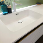 Clean lines meet refined function in this wall-mounted vanity set. Featuring a seamless solid surface basin and a wide marble-effect cabinet front, the design delivers both minimalism and luxury. The spacious double-door storage keeps essentials organized, while the LED backlit mirror with touch sensor adds modern convenience and atmosphere to your daily routine. A sleek brass-tone accent highlights the contemporary aesthetic.