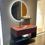 Bold, modern, and full of character—this wall-mounted vanity breaks away from tradition with a striking two-tone design. The upper cabinet in vibrant red houses one large and one small drawer, complemented by a matte black lower unit that features a mix of drawers and open shelving for flexible storage. A red solid-surface basin blends seamlessly into the vanity top, illuminated by an integrated under-cabinet light strip for an elevated, ambient touch. Paired with a circular LED mirror with built-in defogging, this vanity brings both function and flair to contemporary bathrooms.