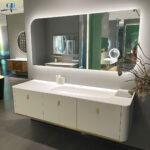 A bold statement in contemporary bathroom design, this large-size wall-mounted vanity blends elegant aesthetics with practical functionality. The wood-textured cabinet is accented with gold-tone metal trims and handles for a refined, luxurious finish. On top, a one-piece sintered stone countertop features an eye-catching asymmetrical basin—durable, stain-resistant, and distinct in design.