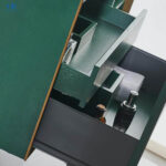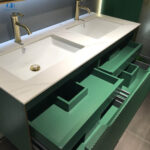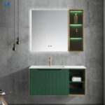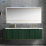 This deep green vanity features a durable sintered stone countertop that’s easy to maintain. It includes dual drawers, each with inner compartments to maximize storage organization. Equipped with two ceramic sinks, it supports simultaneous use comfortably. The square mirror framed in gold metal adds a touch of elegance and includes a shelf for convenient storage. Integrated LED lighting and an anti-fog system ensure clear visibility and enhanced usability. A stylish yet practical addition to any modern bathroom.