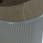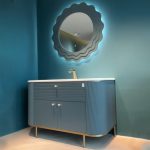 One of our blue vanity cabinets with striped decorative panels, offering a luxurious tactile feel. The front edges are meticulously polished to create smooth rounded curves, enhancing both aesthetics and safety. This cabinet features one large drawer and two doors, providing ample storage space for your bathroom essentials.