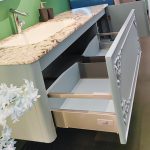 Adorned with intricately carved drawer fronts, adding a touch of artistic flair to the design.