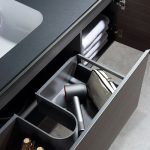 L'armoire est complétée par un élégant comptoir en pierre frittée noire, connu pour sa durabilité et son aspect luxueux. Parfaitement intégré, le comptoir est doté d'un lavabo en céramique sans couture, ajoutant à l'esthétique moderne de l'armoire.