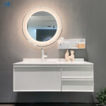 A sleek wall-mounted vanity that brings minimalism and modernity together. Crafted with a premium sintered stone countertop and an integrated ceramic basin, this vanity offers a smooth, durable, and refined surface ideal for daily use. Its handle-less design and crisp white finish create a clean visual line that blends effortlessly with contemporary interiors.Thoughtfully designed drawers and compartments provide practical storage while maintaining the cabinet’s lightweight, floating appearance. Complete with an illuminated round mirror and a compact side shelf for daily essentials, it transforms any bathroom into a stylish, functional space.